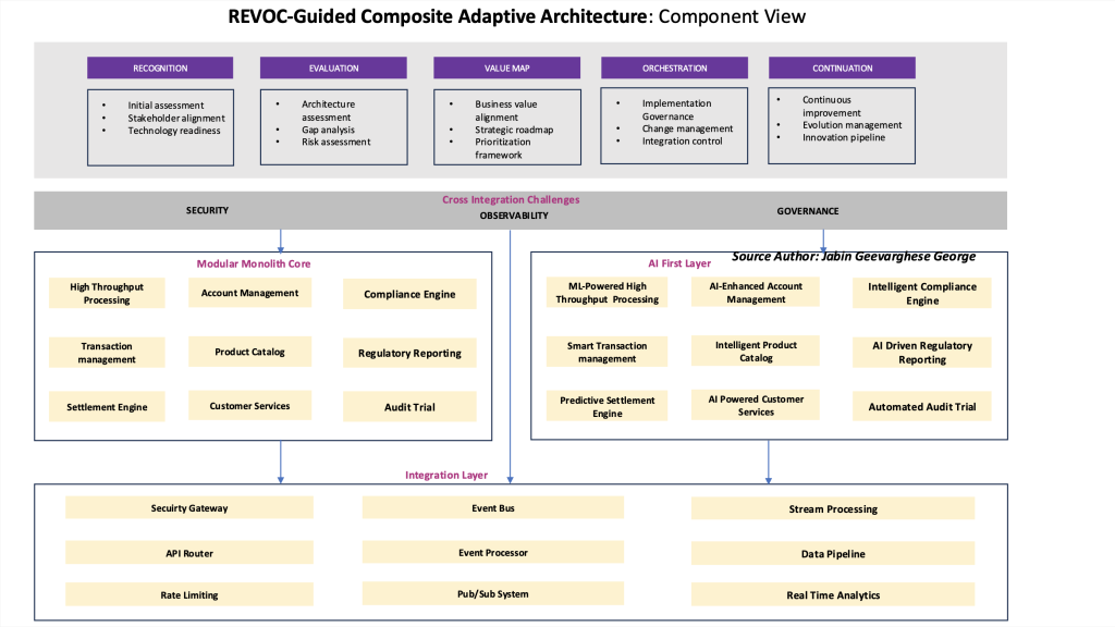 در قلب REVOC، معماری تطبیقی مرکب آن (CAA) قرار دارد، رویکردی انقلابی در معماری سازمانی که لایههای متمایز اما به هم پیوستهای را برای عملکردهای بانکداری سنتی و نوآوری هوش مصنوعی ایجاد میکند. این جدایی از نگرانی ها، همراه با یک لایه یکپارچه سازی پیچیده، مؤسسات مالی را قادر می سازد تا ضمن تسریع ابتکارات هوش مصنوعی، ثبات خود را حفظ کنند.
