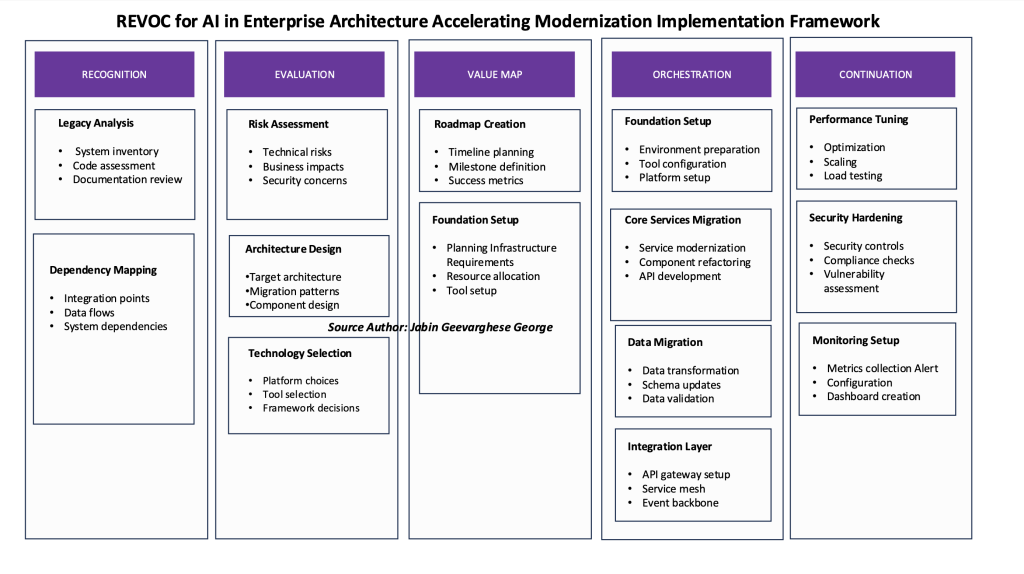 پنج جزء چارچوب REVOC به طور هماهنگ برای ایجاد یک چرخه پیوسته از تکامل معماری کار می کنند. برخلاف چارچوبهای سنتی که معماری را بهعنوان تمرین لحظهای در نظر میگیرند، REVOC یک سیستم زنده ایجاد میکند که با قابلیتهای هوش مصنوعی در حال تغییر و نیازهای تجاری سازگار میشود.