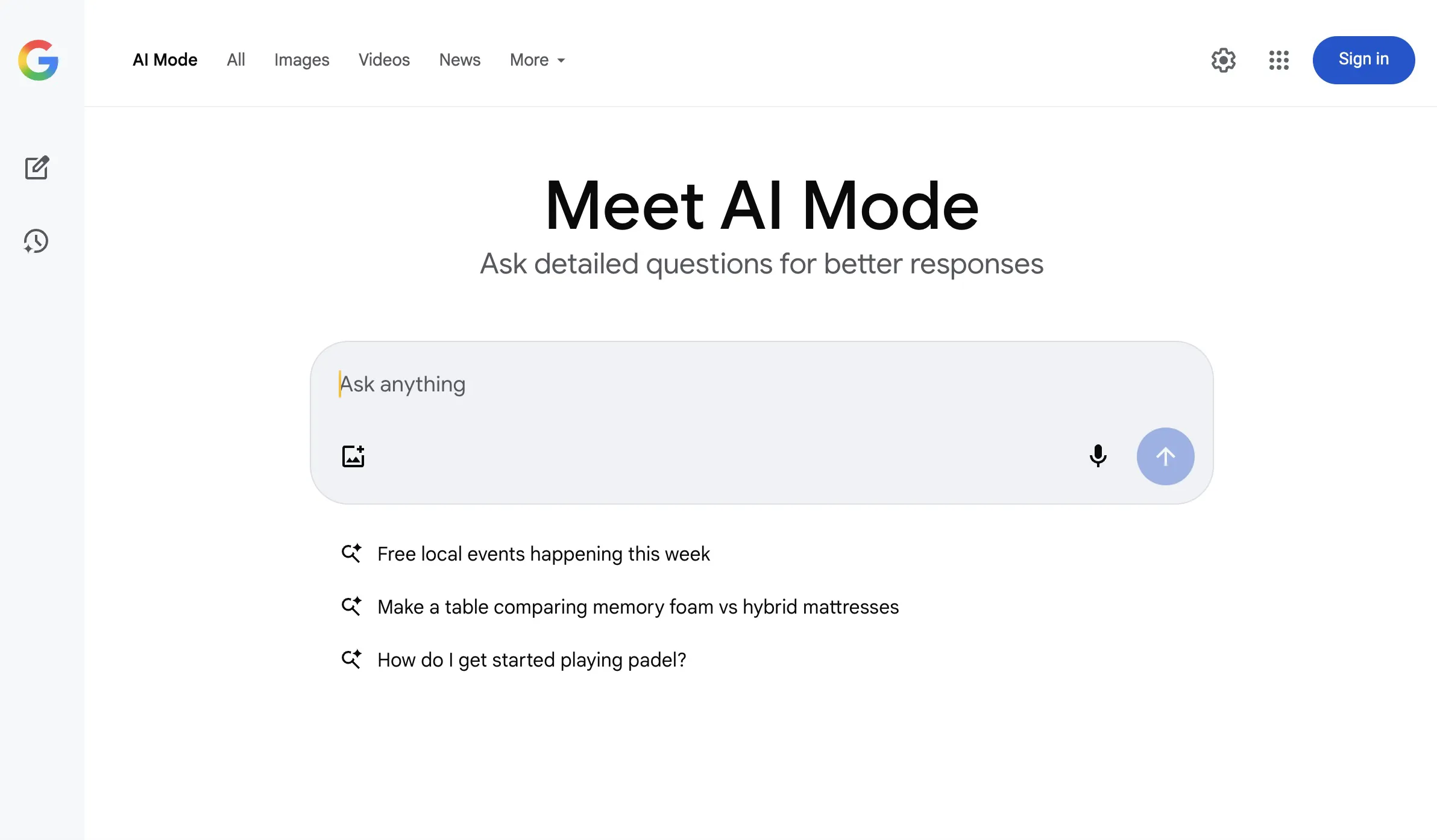 • 21 اوت 2025: Google حالت AI را در سطح جهانی به زبان انگلیسی راه اندازی کرد 180+ کشور و سرزمین.
